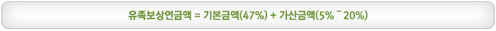 - ±âº»±Ý¾× : ±Þ¿©±âÃÊ¿¬¾×(Æò±ÕÀÓ±Ý * 365ÀÏ)ÀÇ 100ºÐÀÇ 47¿¡ »ó´çÇÏ´Â ±Ý¾× - °¡»ê±Ý¾× : À¯Á·º¸»ó¿¬±Ý¼ö±ÞÀÚ°ÝÀÚ 1ÀÎ´ç ±Þ¿©±âÃÊ¿¬¾×ÀÇ 100ºÐÀÇ 5¿¡ ÃÖ´ë 4ÀαîÁö(20%) °¡»ê |